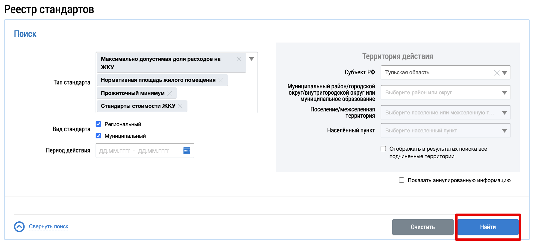 Воспользуйтесь блоком поиска. Введите параметры поиска. Значение поля Тип