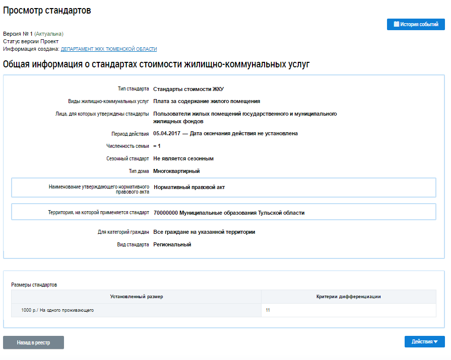 Для просмотра информации о стандартах стоимости ЖКУ нажмите на гиперссылку с наименованием стандарта или раскройте контекстное меню и выберите пункт Просмотреть информацию о стандартах.