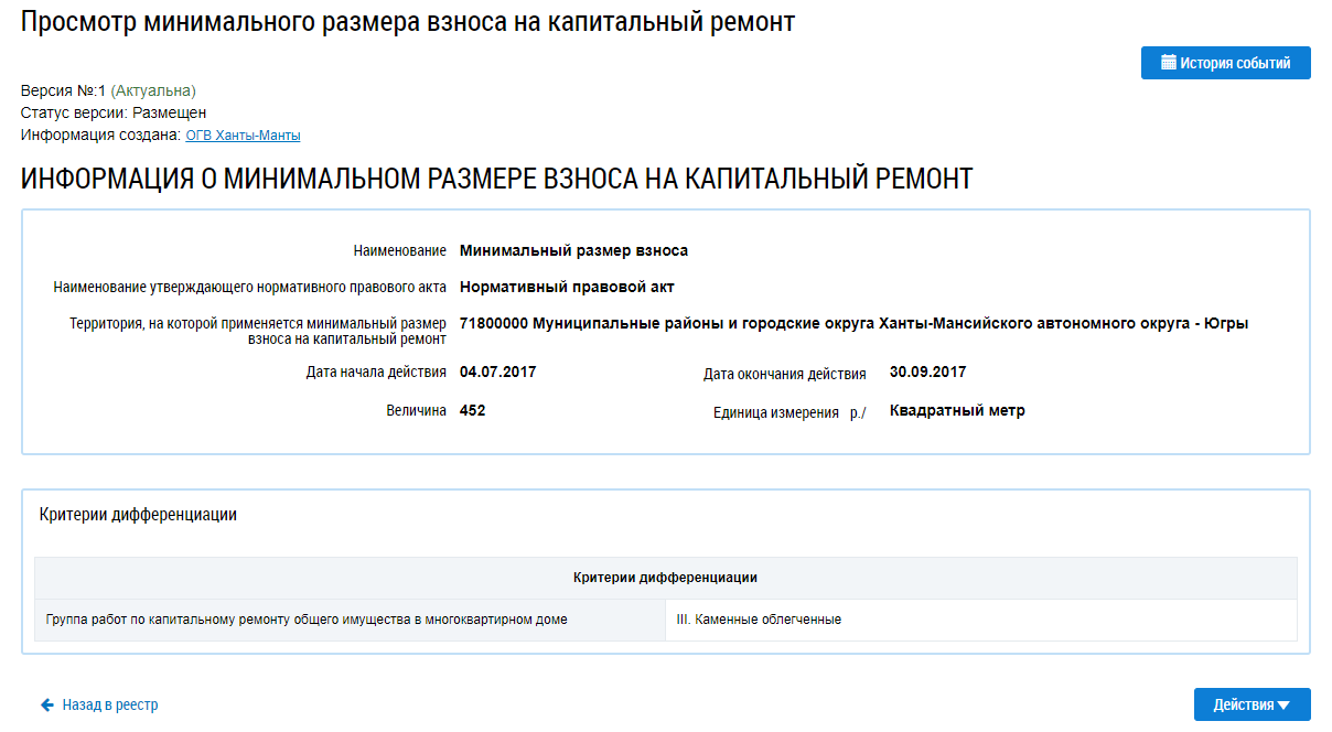 Отображается страница Просмотр минимального размера взноса на капитальный ремонт.