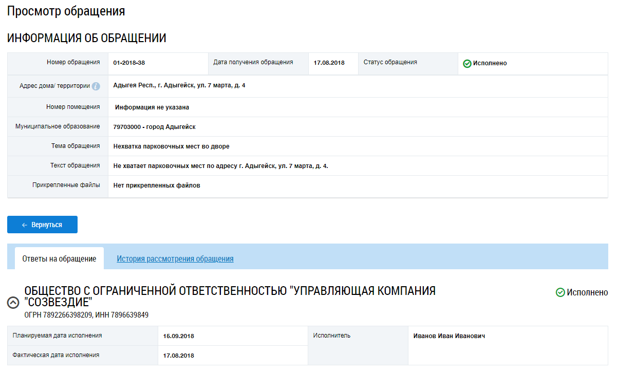 Для просмотра информации об обращении выберите пункт контекстного меню Просмотреть.