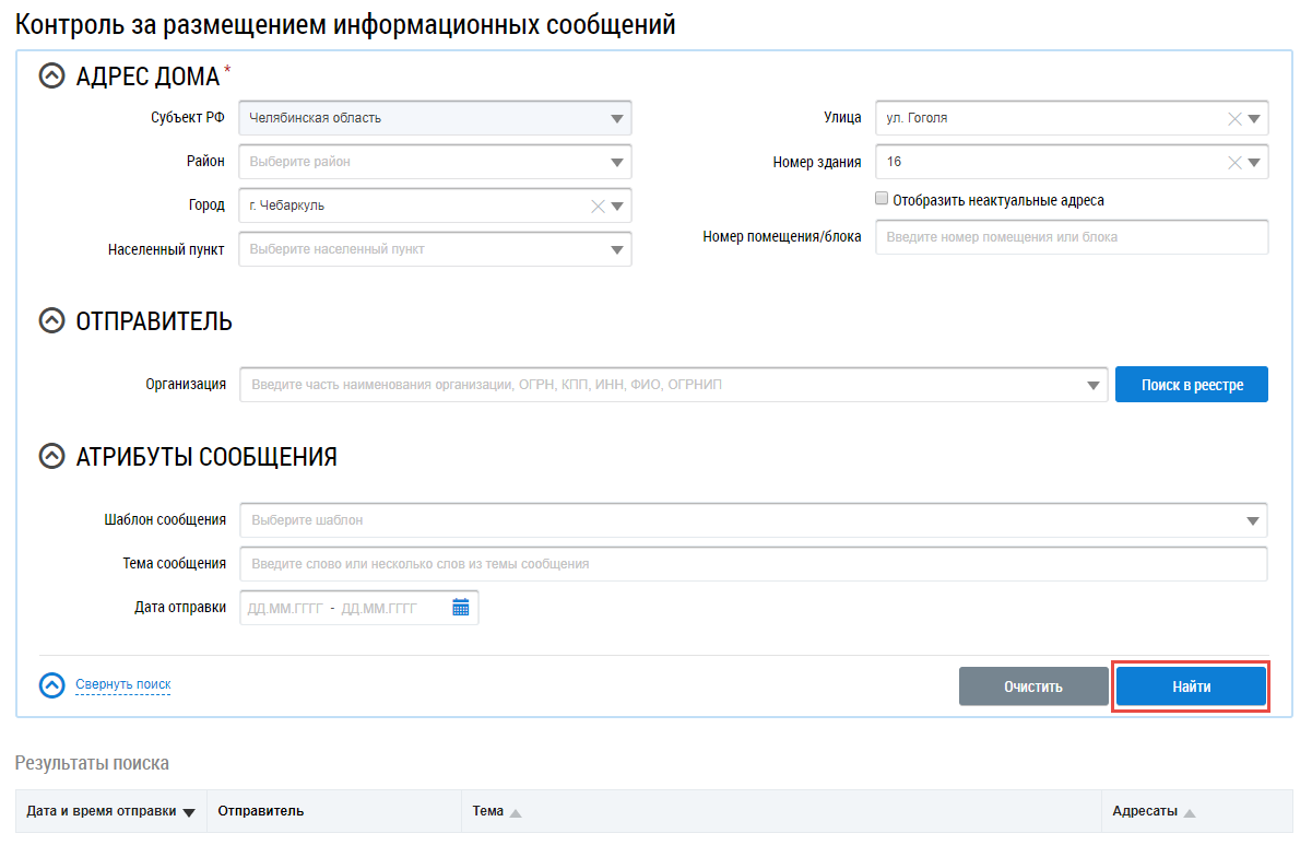 Для поиска информационных сообщений необходимо обязательно заполнить блок Адрес дома до уровня дома. Для заполнения поля Отправитель нажмите на кнопку Поиск в реестре. Для заполнения блока Атрибуты сообщения в поле Шаблон сообщения, выбрав значение из выпадающего списка, введите тему сообщения и дату отправки. Проверьте корректность введенных данных и нажмите на кнопку Найти.