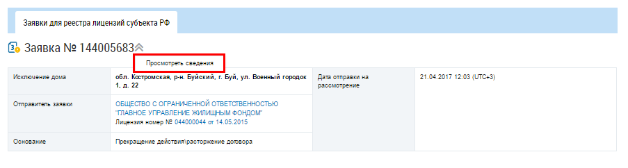 Просмотр сведений о заявке по лицензированию