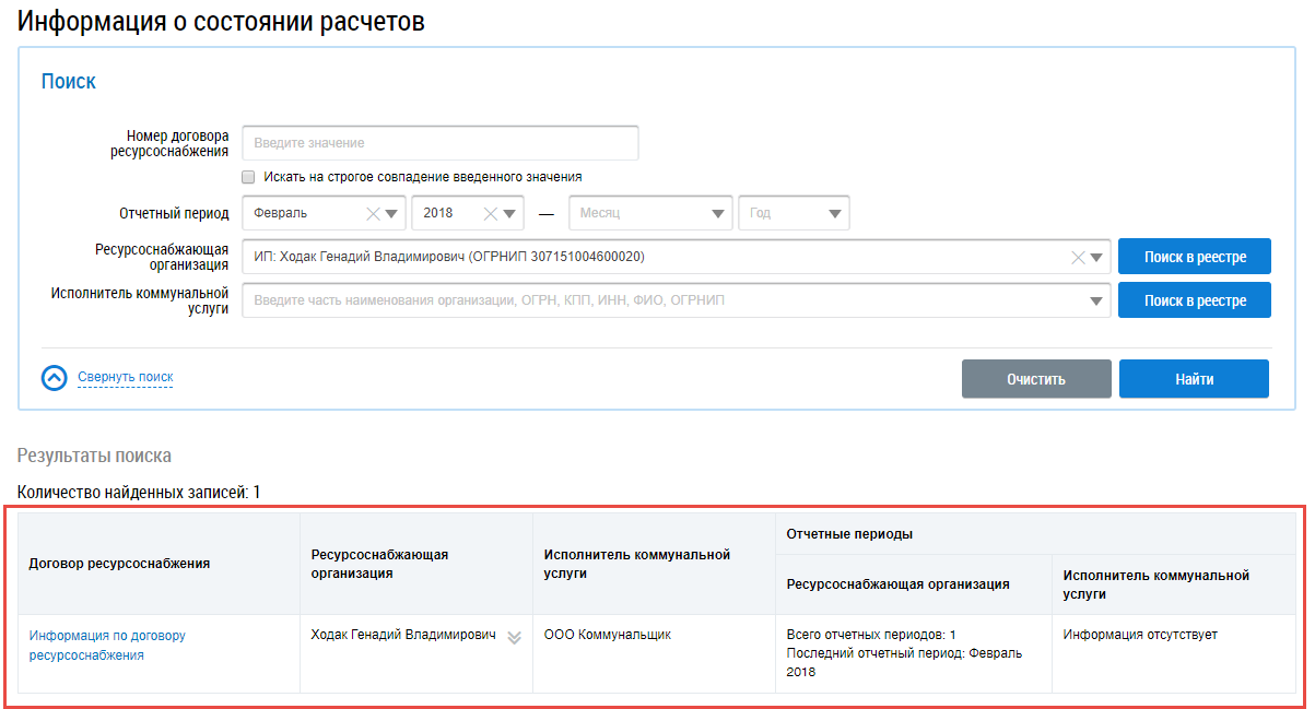 В блоке поиска введите номер договора ресурсоснабжения. Для осуществления поиска информации, необходимо выбрать Ресурсоснабжающую организацию или Исполнителя коммунальных услуг, нажав на кнопку Поиск в реестре.