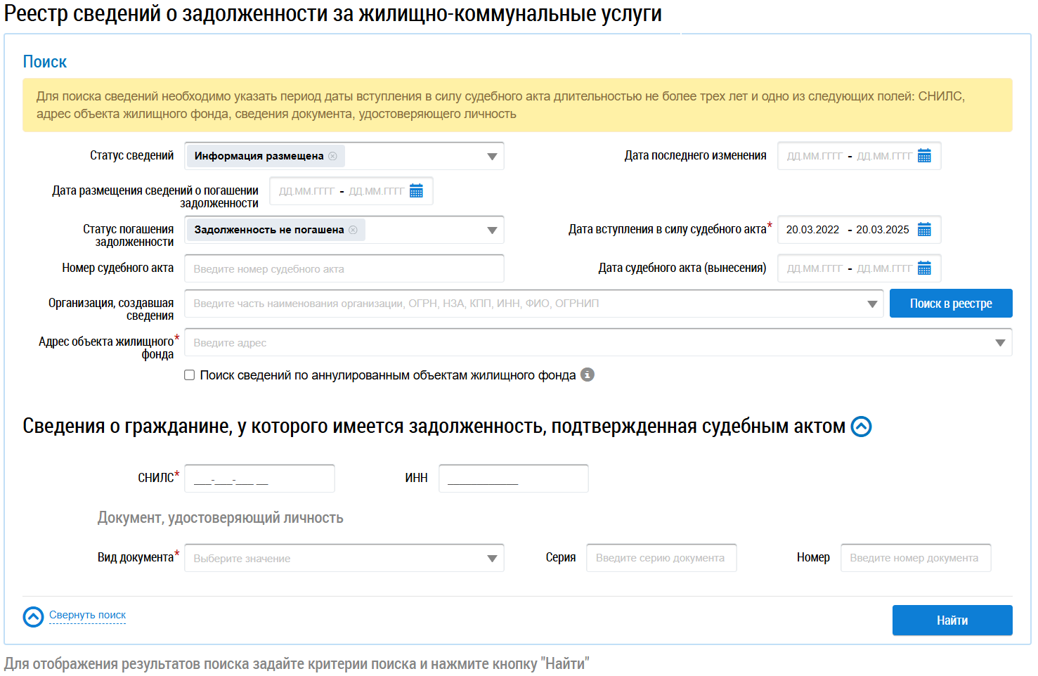 Для поиска по реестру заполните одно или несколько полей блока поиска. Чем точнее будет составлен поисковый запрос, тем уже будет выборка результатов.
