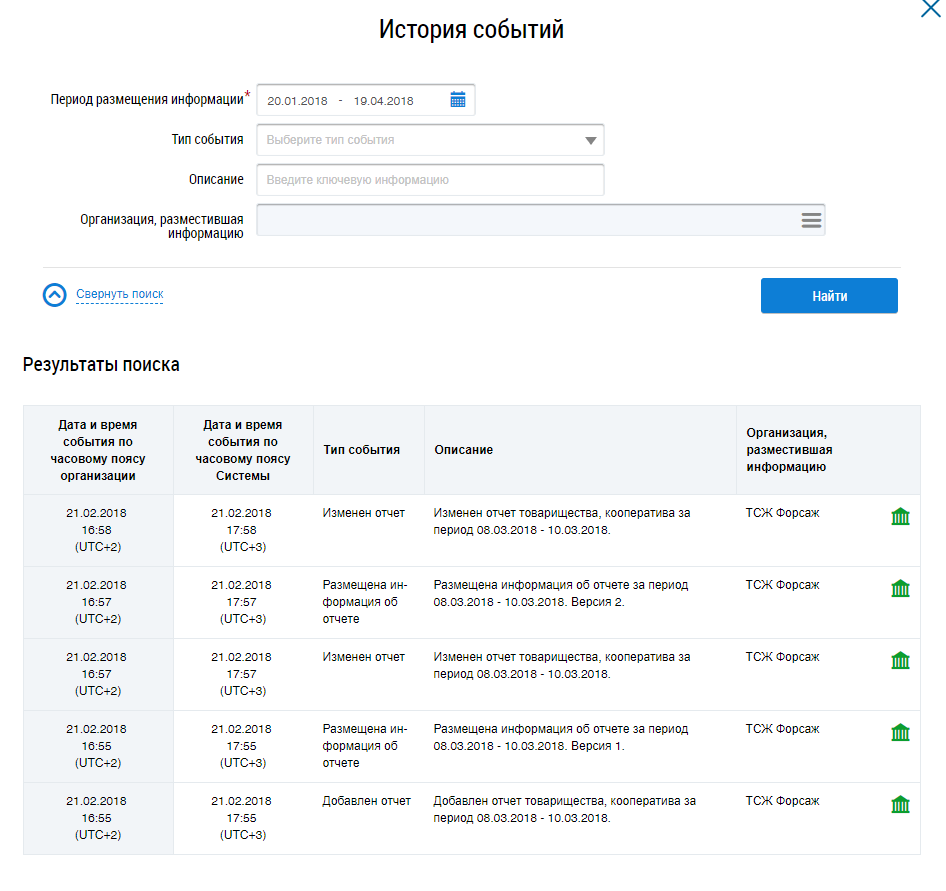Возможность просмотра доступна для документов в статусе Информация размещена. Для просмотра отчета выберите нужный отчет в блоке результатов поиска реестра отчетов товарищества и кооператива и нажмите на гиперссылку с периодом отчета.