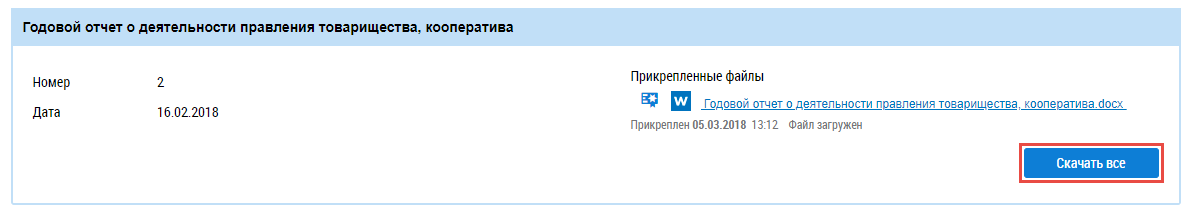 Для скачивания файлов годового отчета о деятельности нажмите на кнопку Скачать все в блоке Годовой отчет о деятельности правления товарищества, кооператива. Для скачивания отдельного файла нажмите на гиперссылку с названием файла.