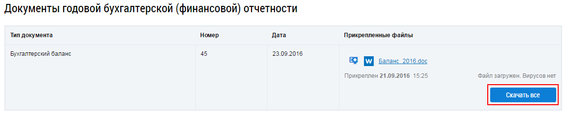 Для скачивания файлов годовой бухгалтерской отчетности нажмите на кнопку Скачать все в блоке Документы годовой бухгалтерской (финансовой) отчетности. Для скачивания отдельного файла нажмите на гиперссылку с названием файла.