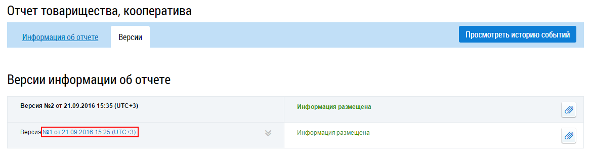 Система сохраняет все версии отчетов. Для просмотра списка версий перейдите на вкладку Версии.