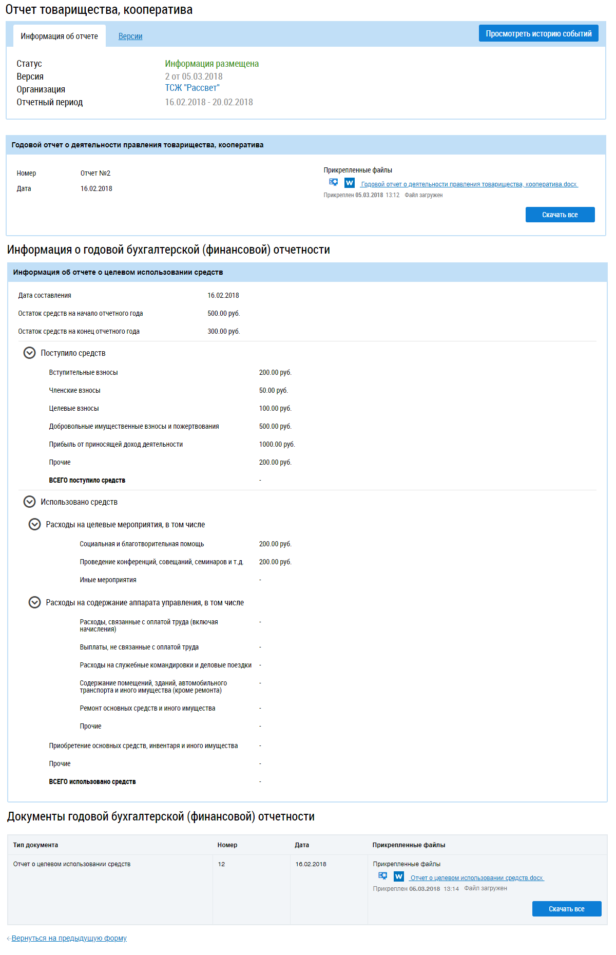 Просмотр отчета товарищества, кооператива