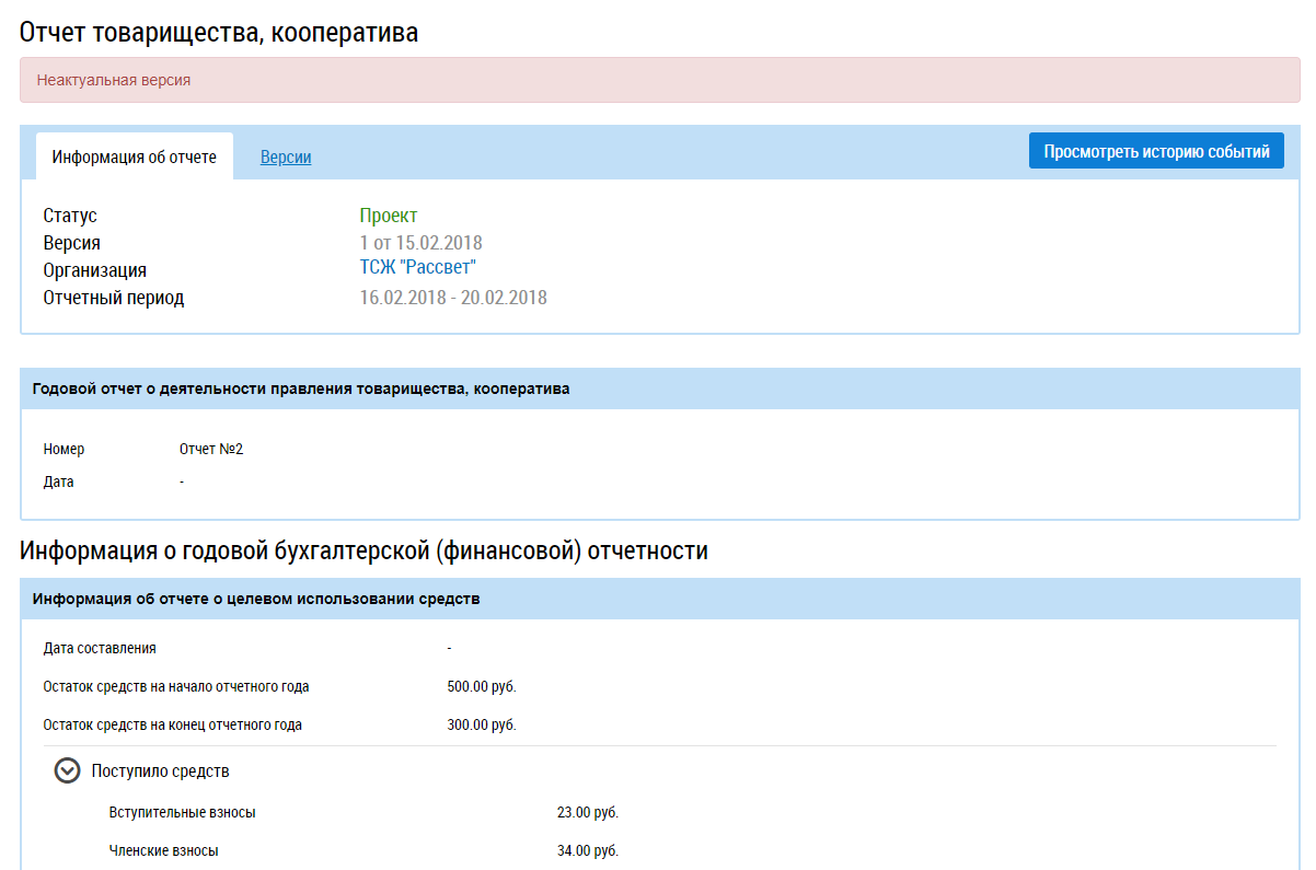 Для просмотра неактуальных версий нажмите на гиперссылку с номером версии. Отображается страница Отчет товарищества, кооператива» с информацией о неактуальной версии отчета.