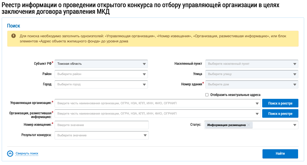 Отображается страница Реестр информации о проведении открытого конкурса по отбору управляющей организации в целях заключения договора управления МКД.