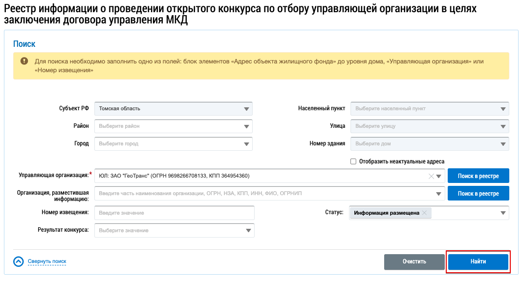 Для осуществления поиска заполняйте последовательно поля, начиная с поля Субъект РФ. Для заполнения поля Управляющая организация нажмите на кнопку Найти.