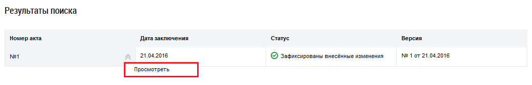 Для поиска актов приемки выполненных работ выберите значения из выпадающего списка в полях Номер акта и Статус, введите период даты заключения и нажмите на кнопку Найти. Акты приемки выполненных работ, удовлетворяющие результатам поиска, отображаются в блоке Результаты поиска.