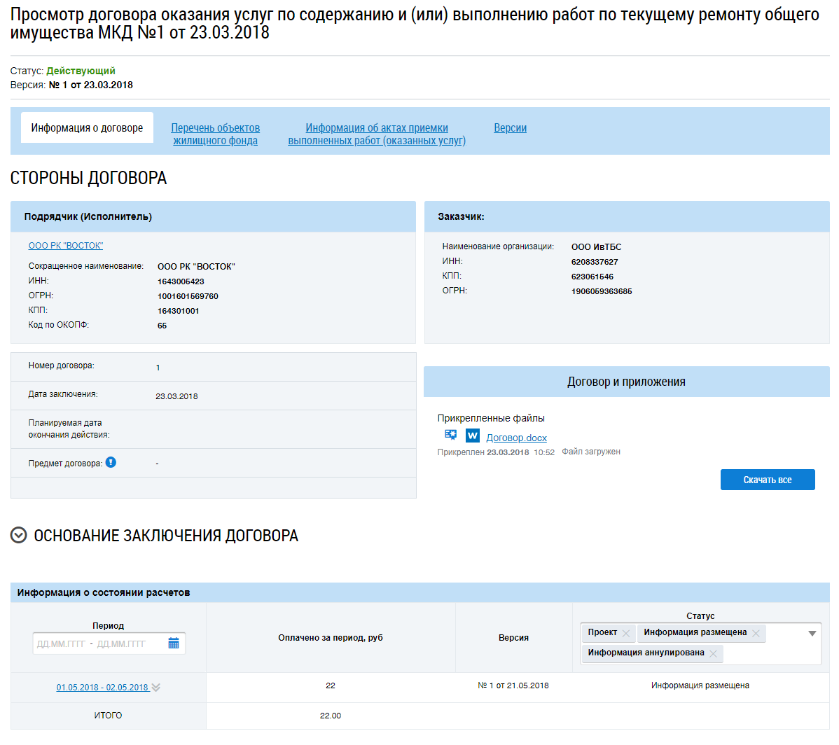 Просмотр договора оказания услуг по содержанию и (или) выполнению работ по текущему ремонту общего имущества в МКД