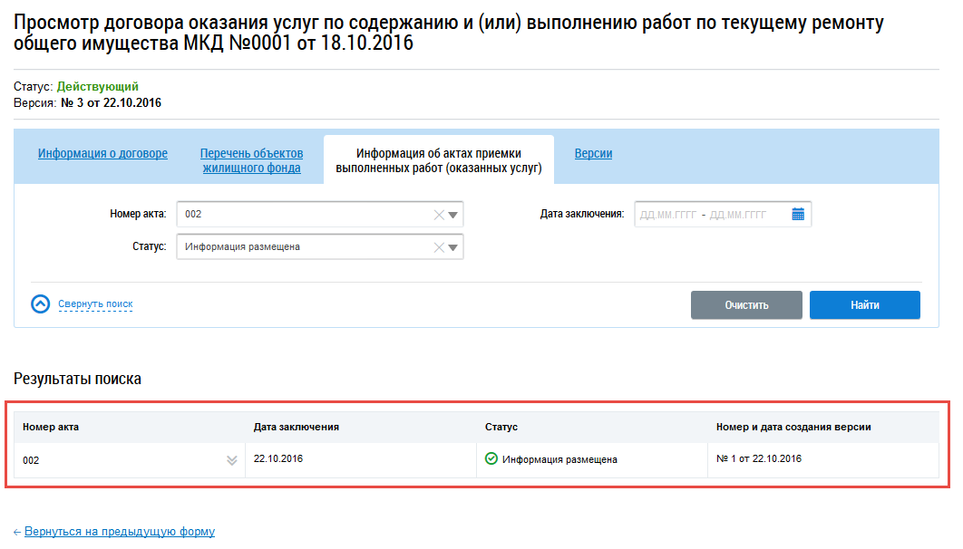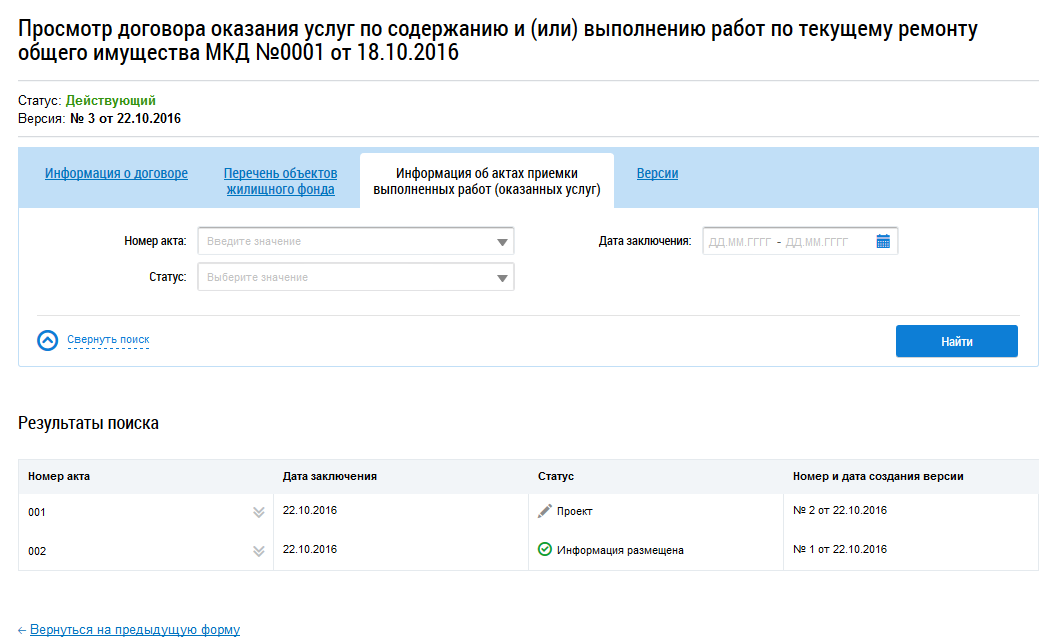 Для просмотра информации об актах приемки выполненных работ (оказанных услуг) перейдите на вкладку Информация об актах приемки выполненных работ (оказанных услуг).
