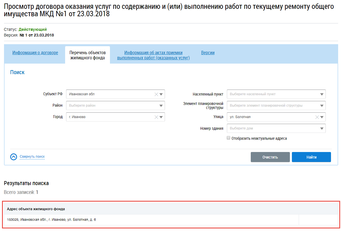 Для поиска объектов жилищного фонда последовательно установите параметры поиска, начиная с поля Субъект, и нажмите на кнопку Найти. Адреса объектов жилищного фонда, соответствующие введенным параметрам, отображаются в блоке Результаты поиска.