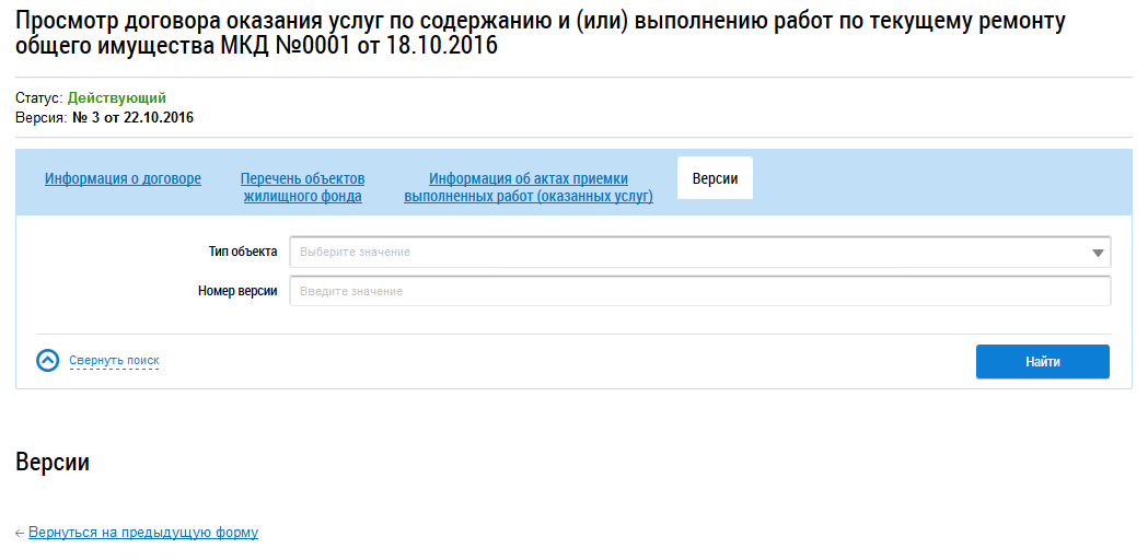 Для поиска версий выберите значение из выпадающего списка в поле Тип объекта, при необходимости введите номер версии и нажмите на кнопку Найти.