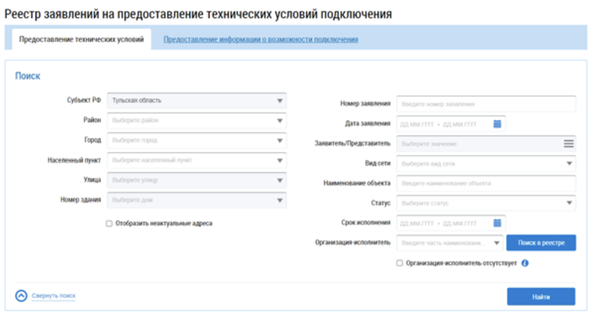 Реестр заявлений на предоставление технических условий подключения