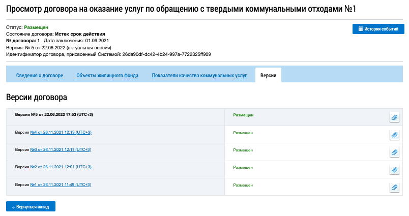 Для просмотра определенной версии договора нажмите на гиперссылку с ее номером. На новой странице отобразится информация о ранее размещенном договоре на оказание услуг по обращению с ТКО.