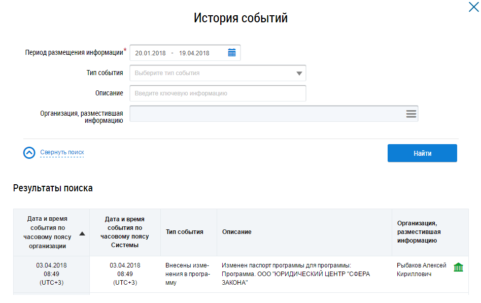 Нажмите на кнопку Найти. В блоке результатов поиска отображаются события, соответствующие параметрам поиска.