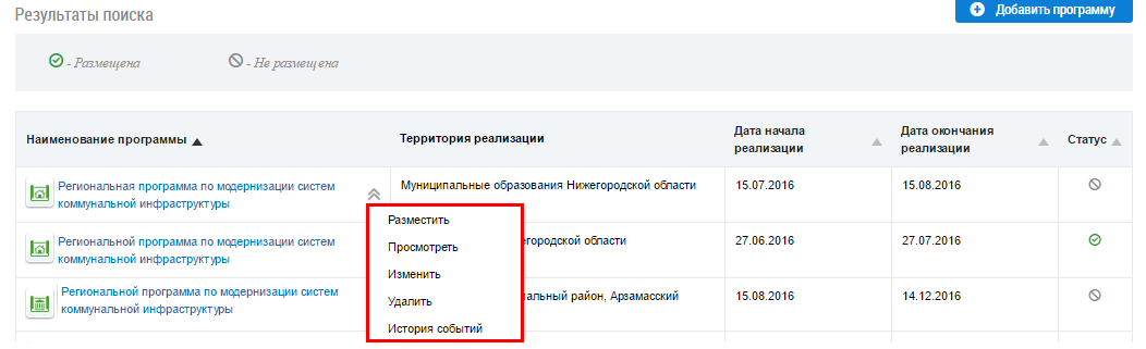 Для просмотра истории событий по программе выберите пункт контекстного меню История событий на странице Реестр программ.