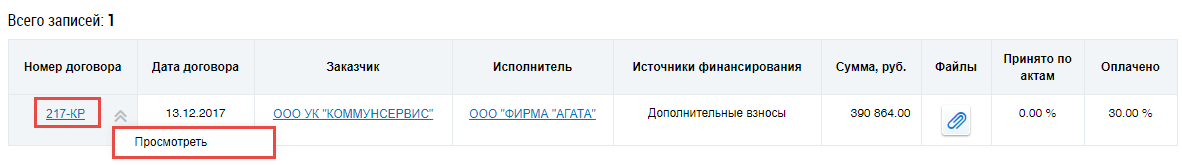 Для просмотра договора на выполнение работ по капитальному ремонту выберите пункт контекстного меню договора Просмотреть или нажмите на гиперссылку с номером договора.