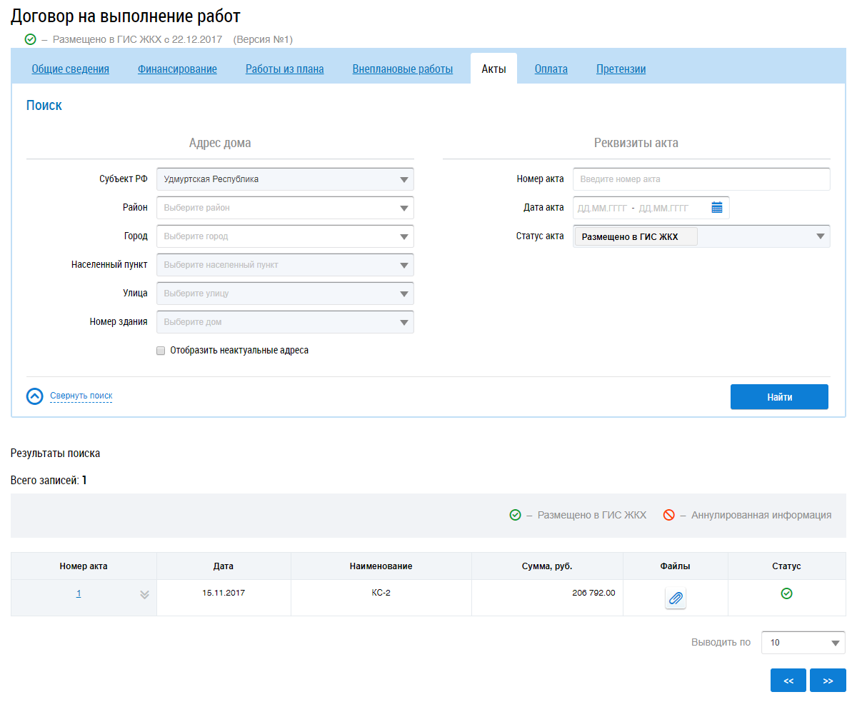 Для поиска актов заполните блоки Адрес дома и Реквизиты акта и нажмите на кнопку Найти. В результатах поиска отображаются соответствующие введенным параметрам акты.