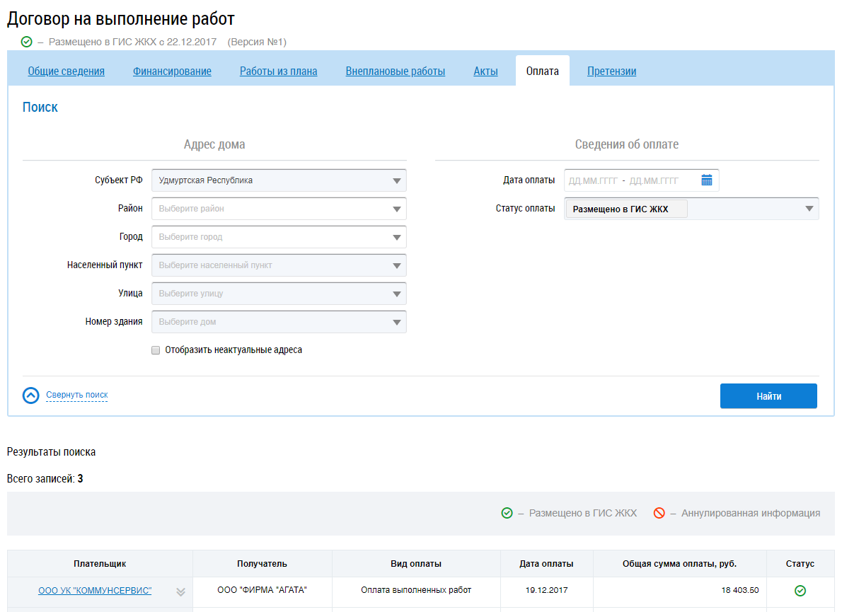 Для поиска информации об оплате заполните блоки Адрес дома и Сведения об оплате и нажмите на кнопку Найти. В результатах поиска отображаются соответствующие введенным параметрам сведения об оплате.