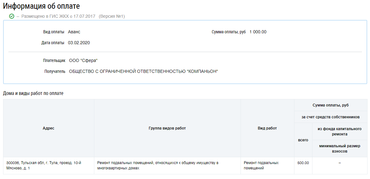 Отображается страница с информацией об оплате, а также о домах и видах работ по оплате.
