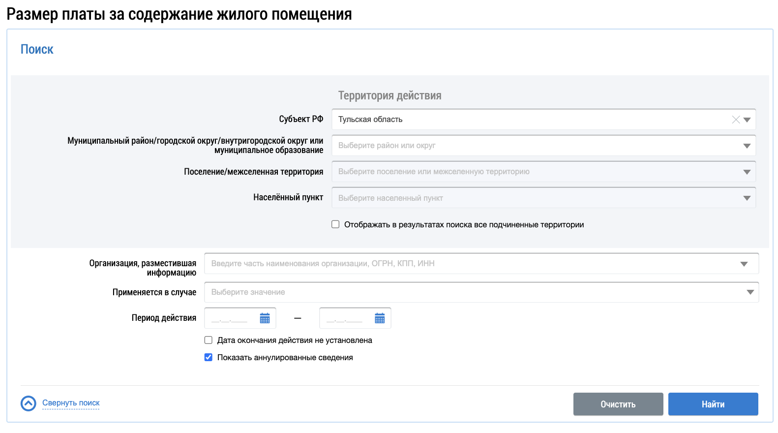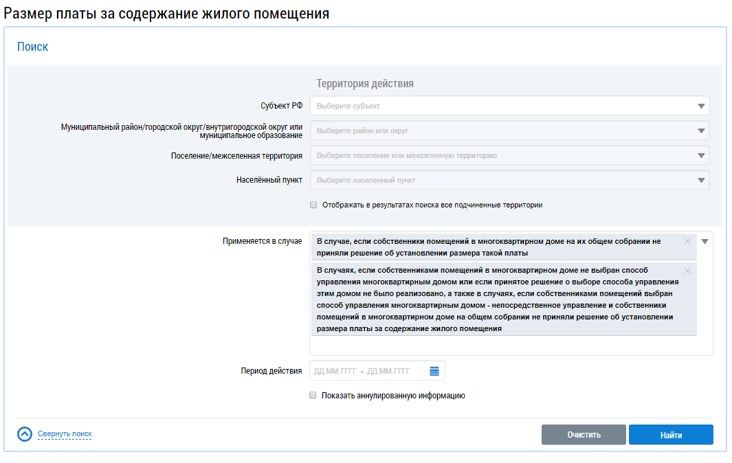 Для поиска информации о размере платы заполните одно или несколько полей блока поиска и нажмите на кнопку Найти. Чем точнее будут заданы критерии поиска, тем уже будет выборка результатов.
