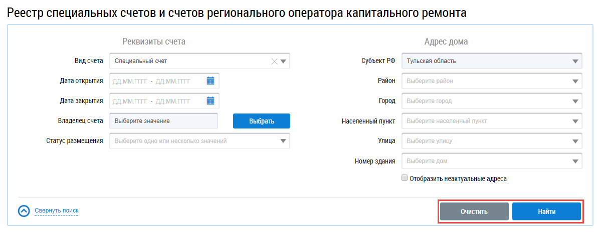 Проверьте корректность введенных данных и нажмите на кнопку Найти. Чтобы очистить заданные параметры поиска нажмите на кнопку Очистить.