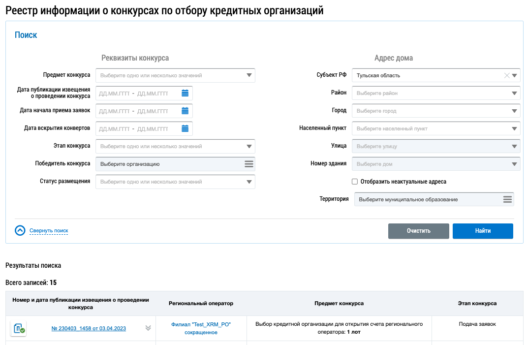 Отображается страница Реестр инфоормации о конкурсах по отбору кредитных организаций.