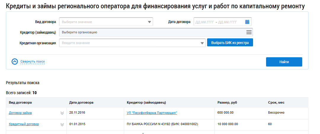Отображается страница Кредиты и займы регионального оператора для финансирования услуг и работ по капитальному ремонту.