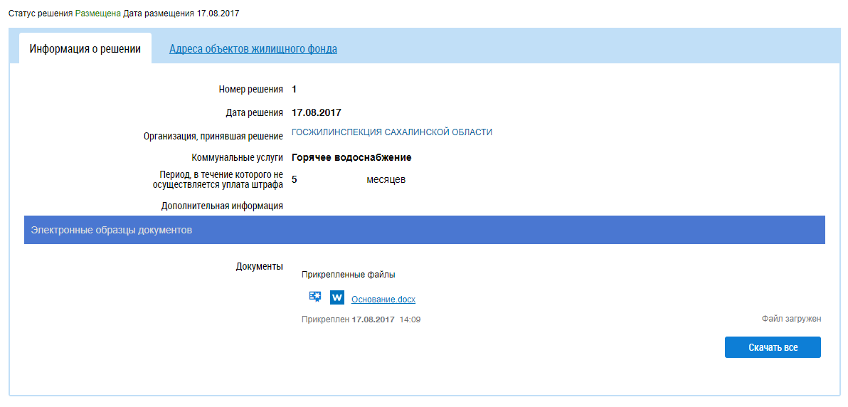 Для просмотра адресов объектов жилищного фонда, по которым принято решение, перейдите на вкладку Адреса объектов жилищного фонда.