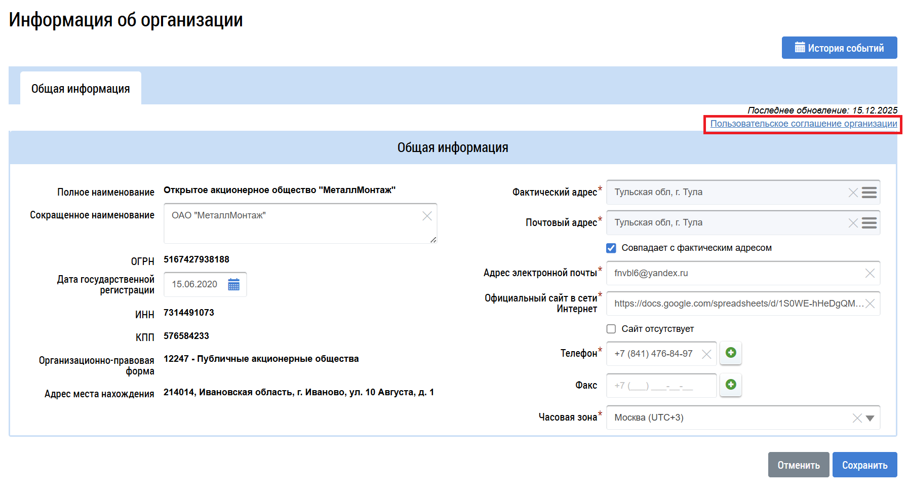 Для ознакомления с пользовательским соглашением организации нажмите на гиперссылку Пользовательское соглашение организации.