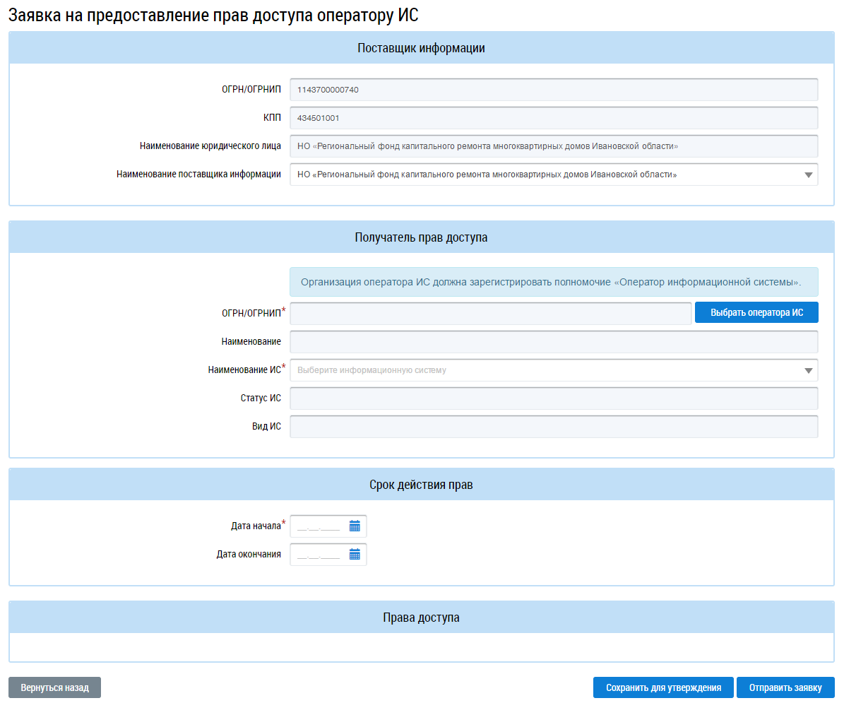 • администратору организации, который не является руководителем – с возможностью сохранения заявки без отправки Оператору ИС, для дальнейшего утверждения и отправки руководителем организации.