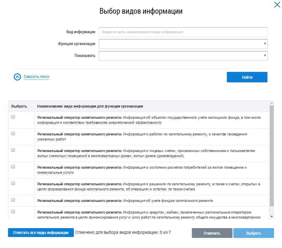 Установите флажок в поле необходимого вида информации и нажмите на кнопку Выбрать. При необходимости выбора всех видов информации нажмите на кнопку Отметить все виды информации.