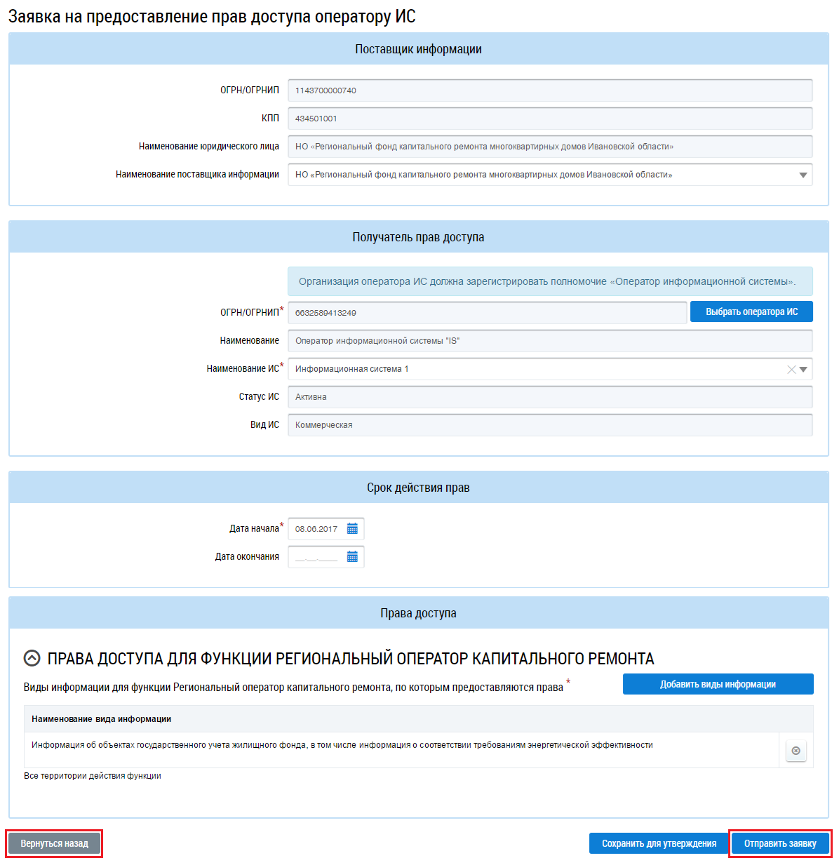Рис. 6. Страница добавления заявки на предоставления прав доступа оператору ИС, кнопки «Отправить заявку», «Вернуться назад»