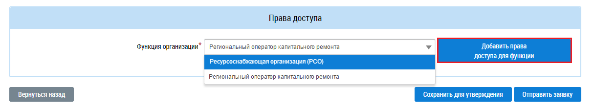 Заполните блок Права доступа. В случае наличия у организации нескольких функций выберите в выпадающем списке поля Функция организации необходимое значение и нажмите на кнопку Добавить права доступа для функции. Если у организации одна функция, данное поле не отображается.