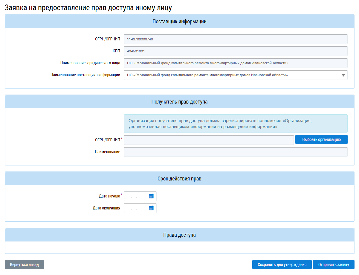 Отображается страница Заявка на предоставление прав доступа иному лицу.