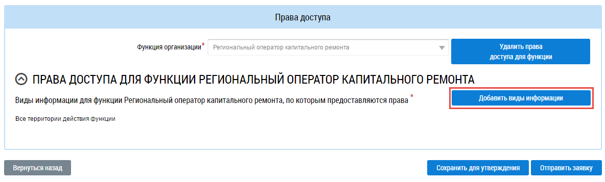 Укажите виды информации, по которым предоставляются права. Для добавления видов информации нажмите на кнопку Добавить виды информации.