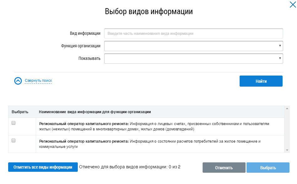 Установите флажки напротив необходимых видов информации или нажмите на кнопку Отметить все виды информации и нажмите на кнопку Выбрать (Окно «Выбор видов информации»).