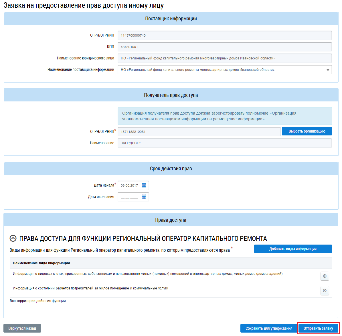 Для отправки заявки получателю прав нажмите на кнопку Отправить заявку (доступно для руководителей организации).