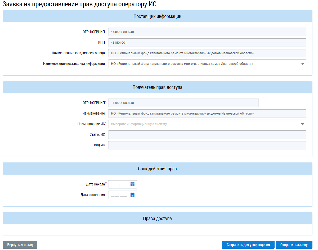 Отображается страница Заявка на предоставления прав доступа оператору ИС.