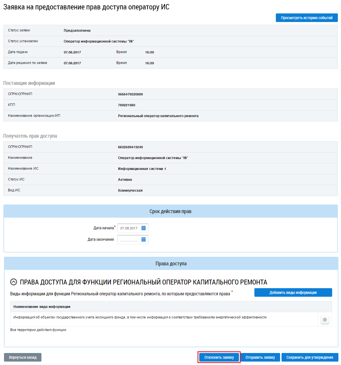 Операция отклонения заявки доступна руководителю организации для заявок в статусе На утверждении и Предзаполнена.