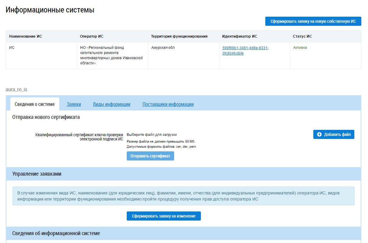 Работа с информационными системами: формирование и отзыв заявки на ИС, просмотр информации об ИС, отправка сертификата ключа.