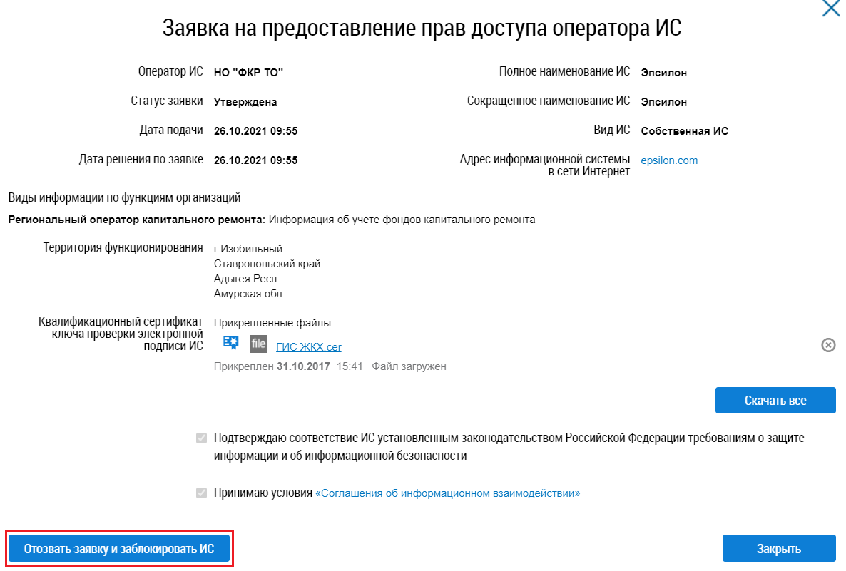 Рис. 2. Окно «Заявка на предоставление прав доступа оператора ИС». Кнопка «Отозвать заявку и заблокировать ИС»
