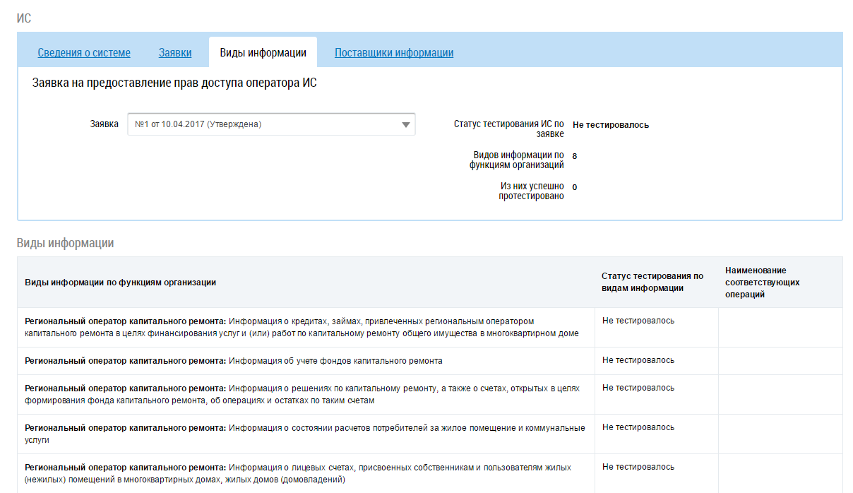Вкладка Виды информации содержит сведения о тестировании ИС и результатах тестирования, если была подана заявка на тестирование. Для просмотра результатов тестирования определенной заявки выберите в выпадающем списке поля Заявка необходимое значение.