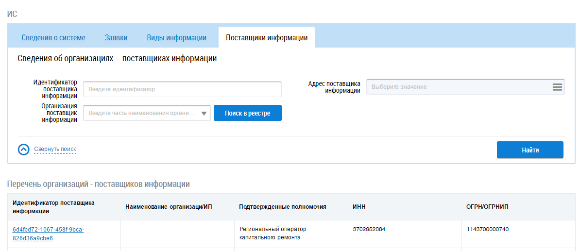 В случае необходимости воспользуйтесь блоком поиска организации. Установите необходимые параметры поиска и нажмите на кнопку Найти. В блоке Перечень организаций-поставщиков информации отобразятся организации, соответствующие поисковому запросу.