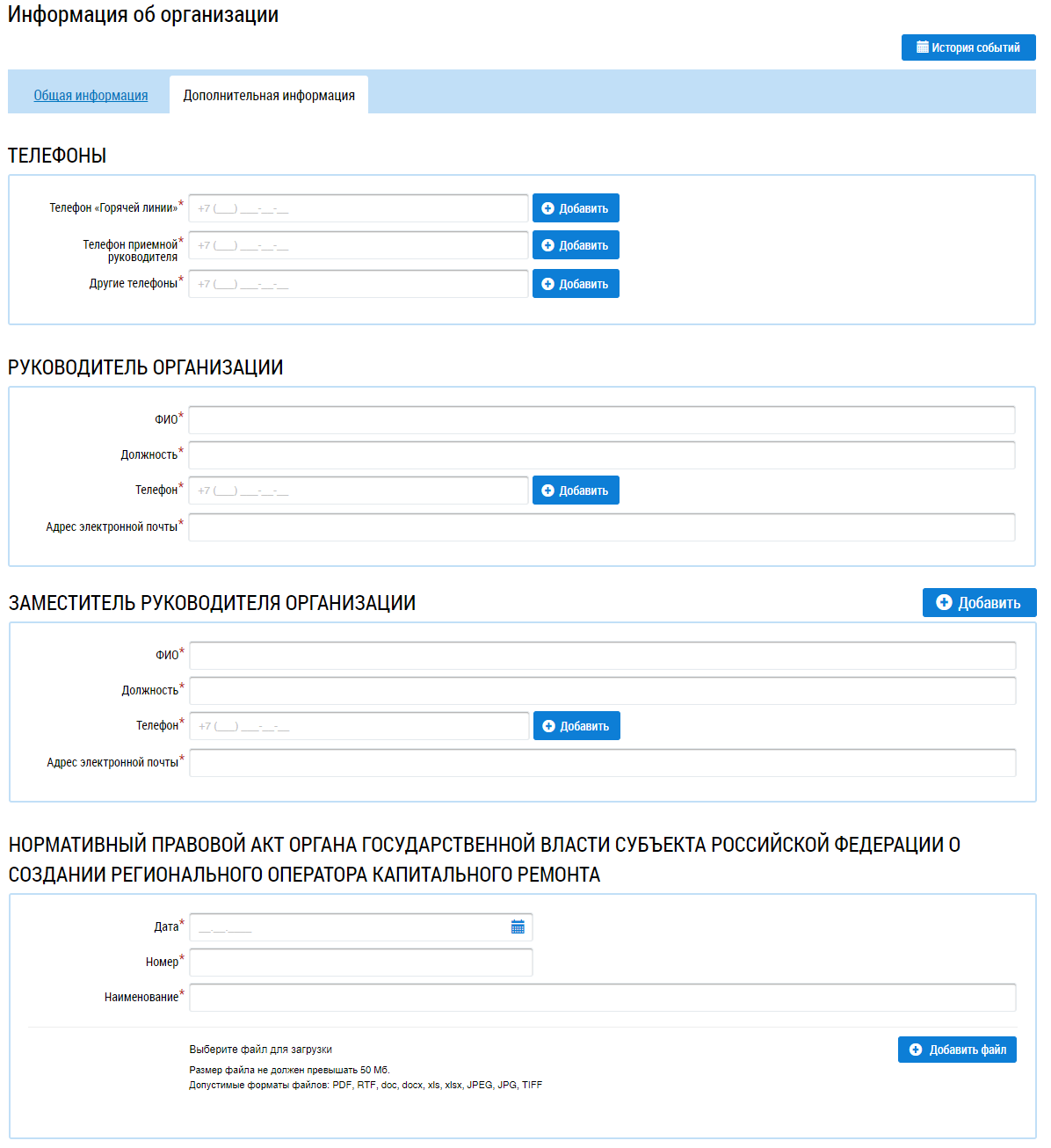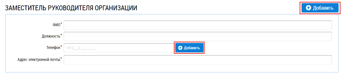 В блоках Руководитель организации и Заместитель руководителя организации введите значения в поля ФИО, Должность, Телефон и Адрес электронной почты. При необходимости добавления информации о нескольких заместителей руководителя или внесения дополнительного номера телефона нажмите на кнопку Добавить.